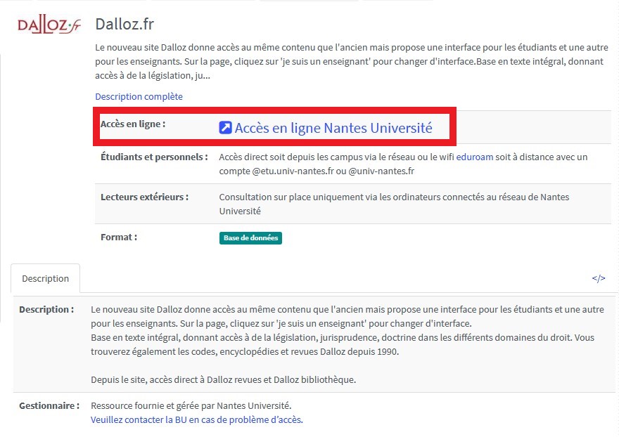 - dans la notice détaillée, présence de la mention Accès en ligne Nantes Université.