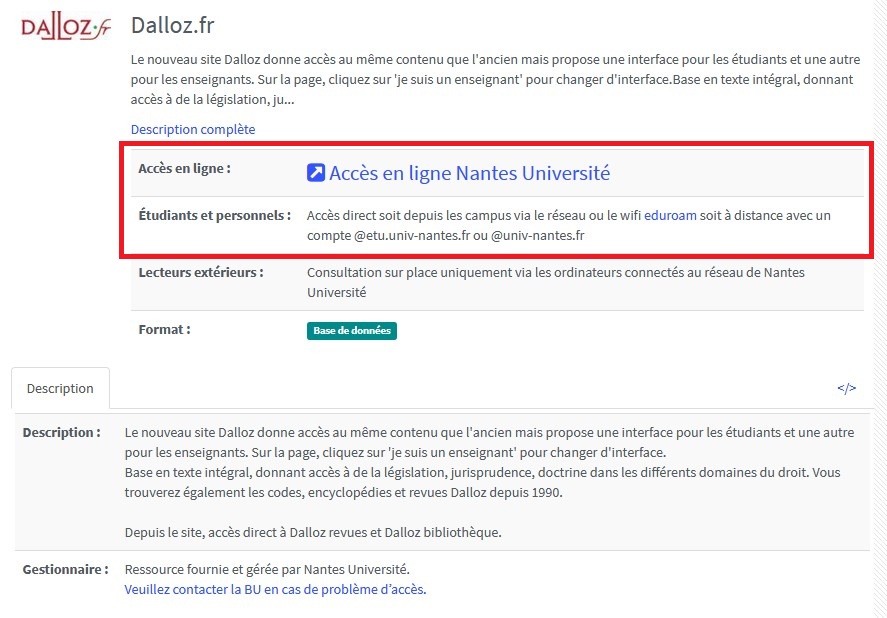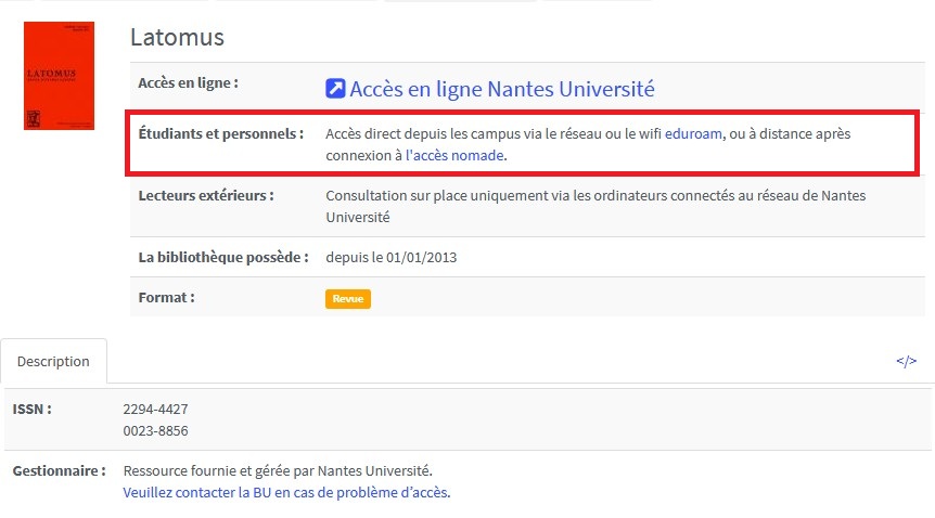 Je n’ai pas besoin de me connecter à Nomade pour accéder à une ressource numérique, quand la mention suivante figure dans la notice détaillée :"Étudiants et personnels : Accès direct soit depuis les campus via le réseau ou le wifi eduroam soit à distance avec un compte @etu.univ-nantes.fr ou @univ-nantes.fr"