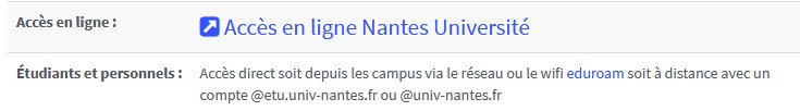 - Accès direct soit depuis les campus via le réseau ou le wifi eduroam soit à distance avec un compte @etu.univ-nantes.fr ou @univ-nantes.fr