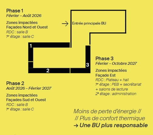 Ils se dérouleront en 3 grandes phases, la première débutant en février 2026. Chacune d’elle nécessitera de cloisonner provisoirement les façades des salles de lecture, entraînant des modifications des usages ainsi que certaines nuisances (perte de lumière et bruits).